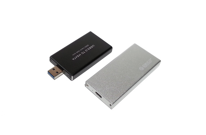 Адаптер — сама «оболочка» нашей флешки. По сути это небольшой контейнер для SSD-накопителя с установленным контроллером USB -> SATA. В качестве моста используются распространенные контроллеры Innostor IS621, ASMedia ASM1153S, ASM1351, ASM235CM, VIA VL716 и другие. Большинство таких адаптеров поддерживают команды TRIM, UASP, NCQ, DevSleep и поддержку SMART. По способу подключения к ПК бывают со встроенным USB 3.0 штекером (без кабеля), либо с гнездом microUSB Type-B или Type-C и комплектным USB-кабелем. Рассчитаны на установку SSD-накопителей mSATA или M.2 (NVMe или SATA).