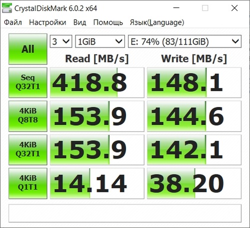 Скорости чтения/записи накопителя, подключенного напрямую к mSATA-разъему материнской платы, составляют около 500/420 МБ/с. При работе через адаптер неизбежны задержки, поэтому скорости меньше.