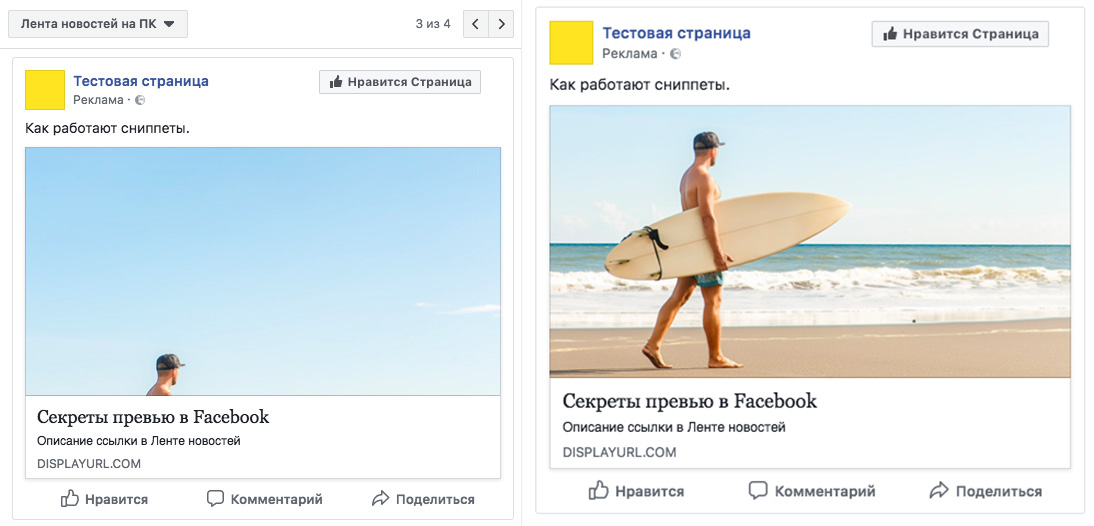 В сниппетах отображается изображение размером 476 × 249 пикселей, но Facebook рекомендует загружать картинки от 1200 × 628 пикселей. Так превью будет хорошо смотреться на мониторах с высоким разрешением.