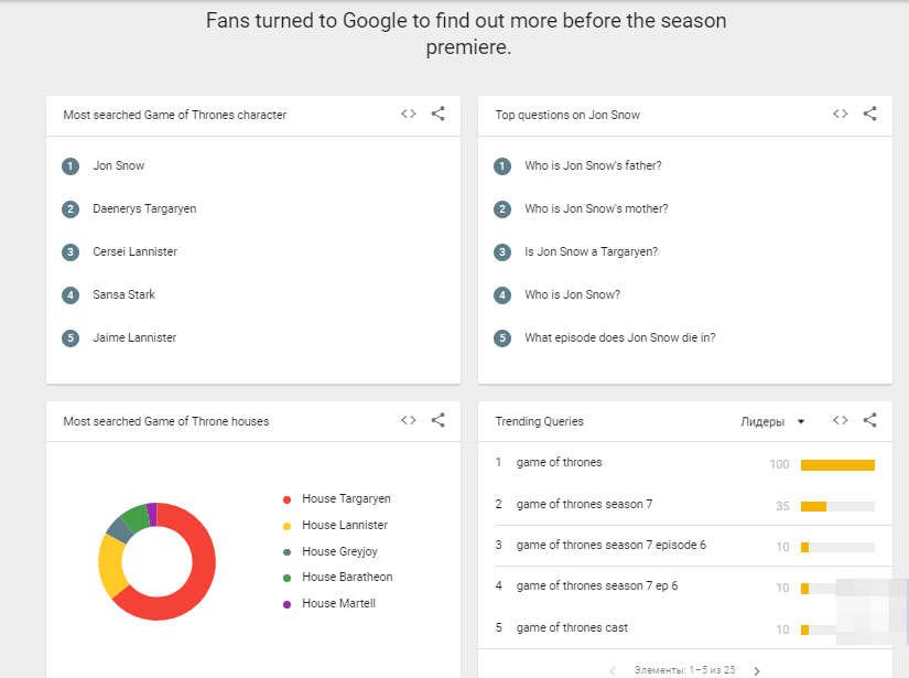 В самом низу страницы Google Trends собирает похожие тематические запросы и показывает уровень их популярности.
