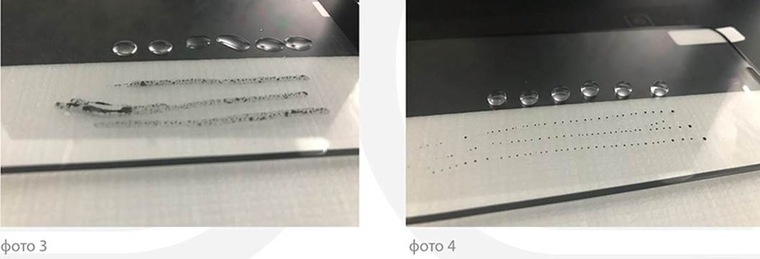 Если капли воды растекаются по поверхности стекла, а нарисованная маркером линия практически не размывается (фото 3), то олеофобное покрытие низкого качества. На фото 4 представлено стекло с качественным олеофобным покрытием: капли собираются, а провести линию маркером невозможно — чернила маркера собираются в точки.