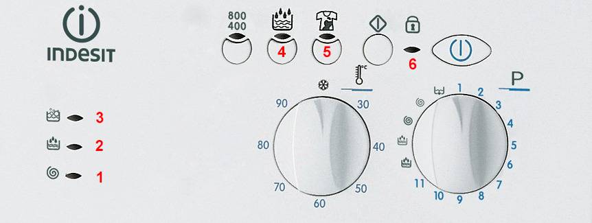 На машинках Indesit без дисплея данная ошибка отображается загоранием индикаторного сигнала «Быстрая стирка» с одновременным миганием лампочки оборотов барабана.