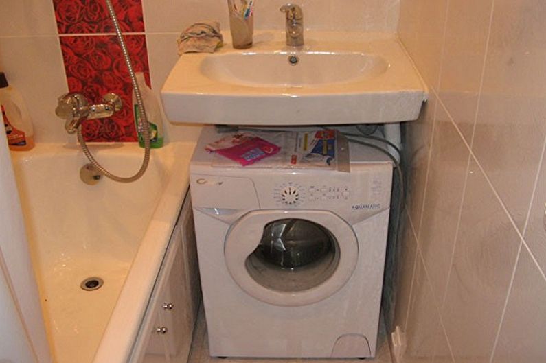 - Место под раковиной. Оно будет занято стиральной машиной, что не всегда может быть удобна для использования, так как обычно под раковиной ничего нет. Также возможно, что люк стиральной машины тоже будет неудобно открывать.