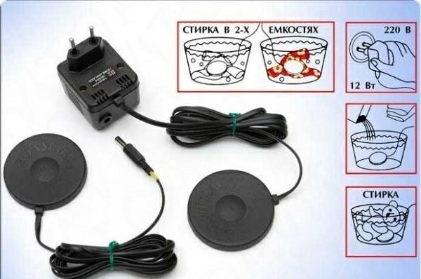 Очень просто: замочите белье в теплой воде (с моющим средством, которым вы пользуетесь обычно), положите в середину активатор УСУ, включите блок питания в сеть и занимайтесь своими делами. Чем больше объем белья, тем дольше стирка и тем чище ваше белье.