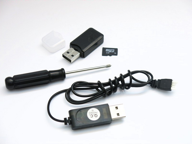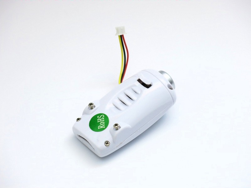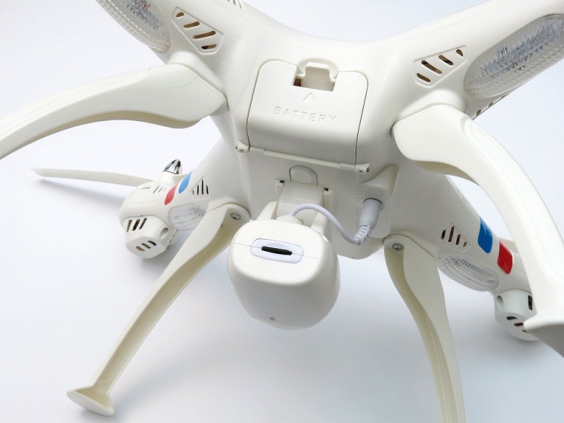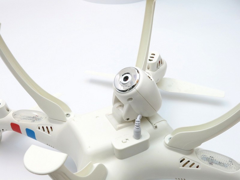 Камера имеет большой угол наклона и крепится к коптеру с помощью защелки. Сзади у камеры присутствует отсек для карты памяти. Питание производится через стандартный разъем 3,5мм аудио.