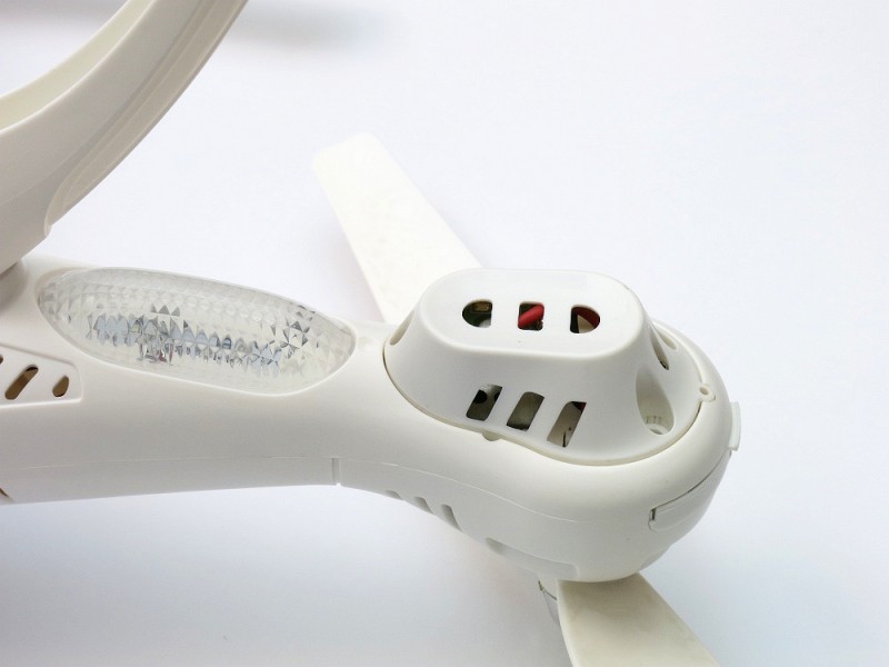 Камеры на борту нет, зато на носу установлен небольшой светодиодный фонарь. Коптер быстро летает и уверенно ведет себя в воздухе. Впрочем, на улице его запускать не рекомендуется. Это типичный дрон для запуска дома.