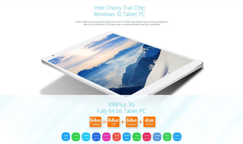 Процессор Intel Atom x5-Z8300 (2 МБ кэш-памяти, четырехъядерный, до 1,84 ГГц) со встроенным графическим процессором Gen8, 4 ГБ оперативной памяти LPDDR3, 64 ГБ памяти eMMC, Bluetooth 4.