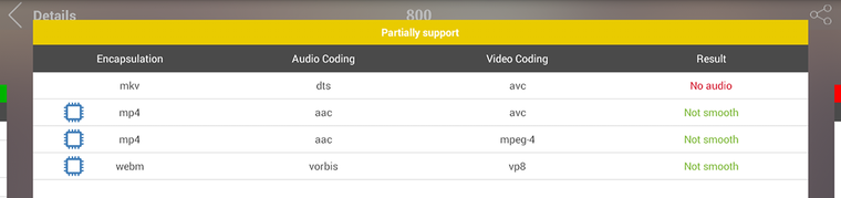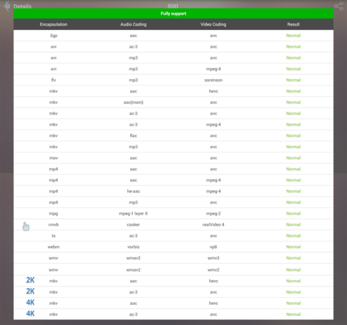 В AnTuTu Video Tester телевизор набрал 800 попугаев и оптимистично заявил о полной поддержке практически всех форматов, в том числе UHD (2К и 4К)