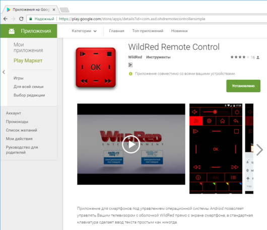 Управлять телевизором на расстоянии, помимо комплектного ПДУ, можно и со смартфона, установив на последний приложение WildRed Remote Control с Google Play