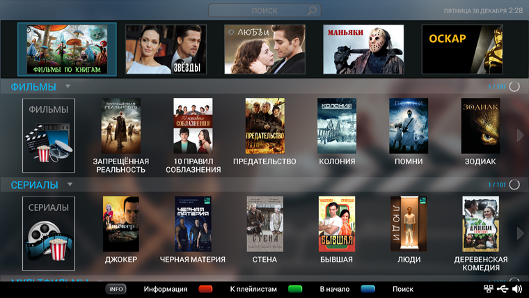 Раздел «Фильмы» содержит просто огромный каталог с постерами и описаниями (на листание каталога можно потратить не меньше времени, чем на сам просмотр фильма)