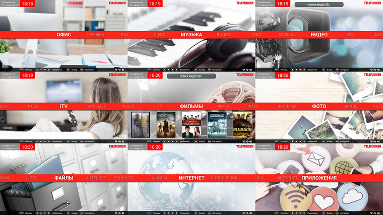Мультимедиа оболочка Smart-TV состоит из 9 пунктов, при этом добавить или удалить лишние возможности нет
