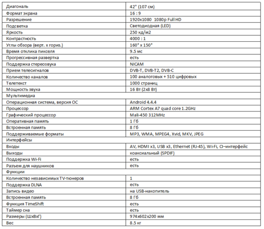 И подробные характеристики телевизора Telefunken TF-LED42S39T2S в таблице ниже