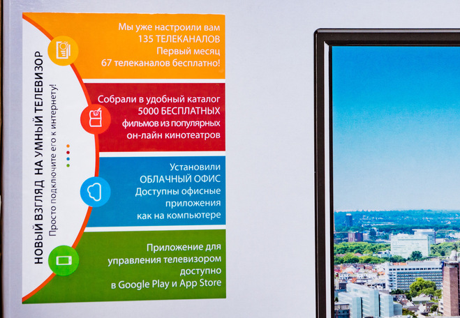 О доступности огромного каталога бесплатных фильмов и большом списке телеканалов, доступных при подключении телевизора к сети интернет информирует отдельная наклейка.