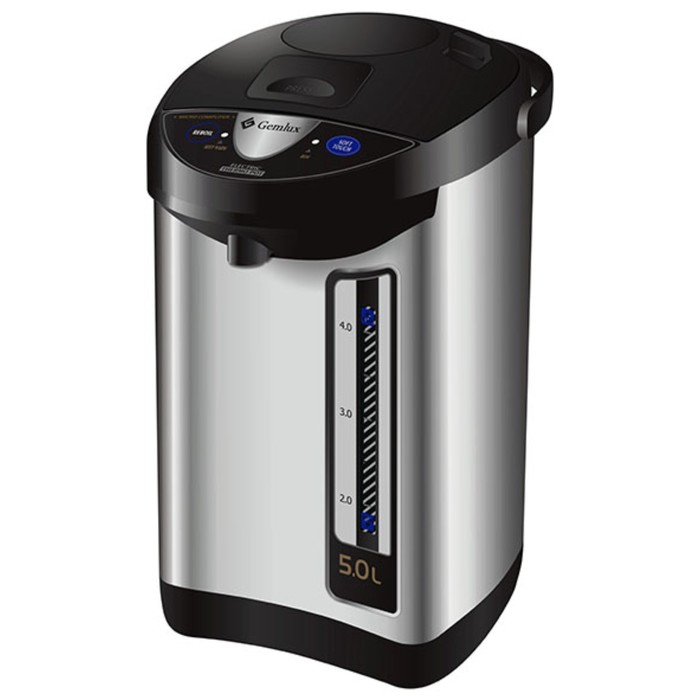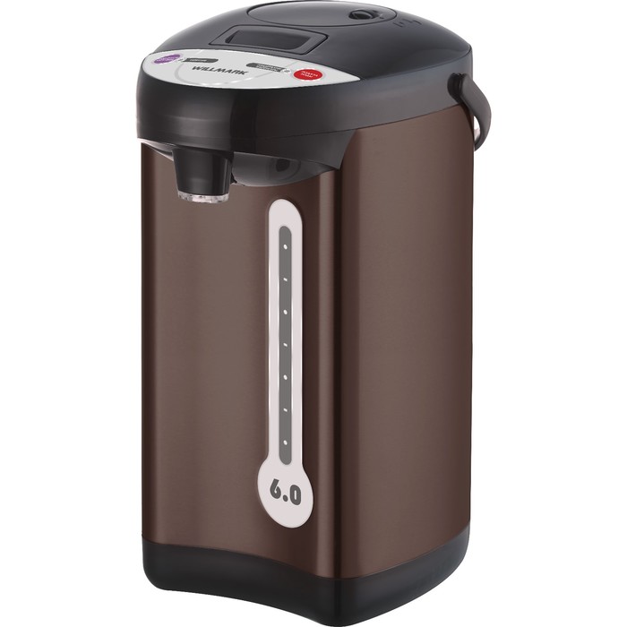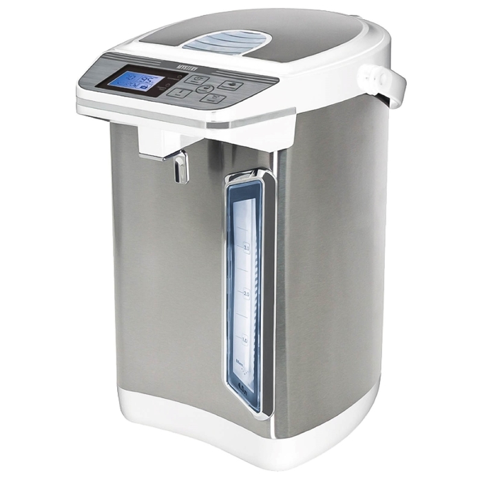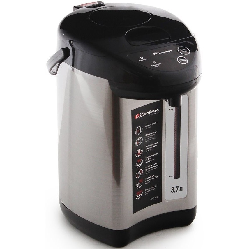 Небольшой термопот на 3 л потребляет 700 Вт во время нагрева и всего 25 Вт на поддержание температуры. У него 2 режима – 60°С для детских смесей и 98°С для горячих напитков. Между стенками корпуса проложена панель вакуумной изоляции, которая сохраняет тепло воды даже при отключении электричества и не позволяет корпусу сильно нагреваться. Фирменное покрытие внутри колбы уменьшает образование накипи. Единственный минус – нет автоматической подачи воды, но ручная помпа достаточно удобная и надежная.
