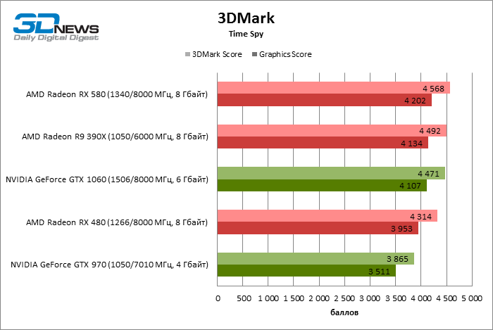 Участники тестирования В тестировании производительности приняли участие следующие видеокарты: ⇡#Производительность: 3DMarkВ синтетических тестах Radeon RX 580 показал на 11% более высокий результат по сравнению с RX 480 и превзошел соперников, от которых его предшественник потерпел поражение, — как Radeon R9 390X, так и GeForce GTX 1060.
