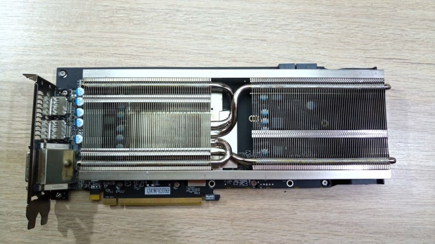 Взглянем на систему охлаждения со снятым кожухом. Это довольно крупный радиатор с четырьмя тепловыми трубками — две увеличенного диаметра 8 мм и две по 6 мм.