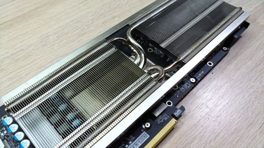 Радиатор набран из массива тонких пластин, в конструкции задействовано четыре тепловые трубки.