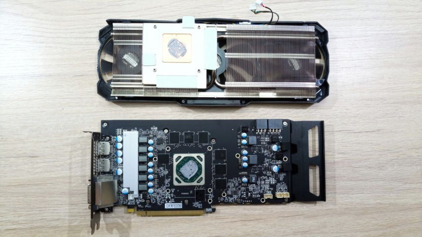 У радиатора крупное основание, которое контактирует с микросхемами памяти. В центре медная пластина, отводящая тепло от графического чипа. Также на радиаторе есть выступ с напаянной пластиной, которая является контактной площадкой элементов VRM. Так что единый охладитель отводит тепло сразу от всех элементов на плате.