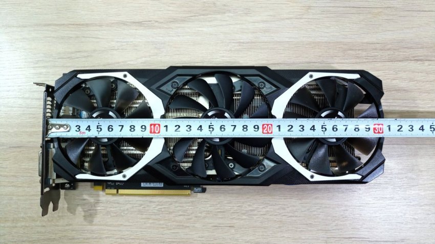 Видеоадаптер длиной 25 см, занимает два слота расширения. Система охлаждения оснащена двумя вентиляторами, по бокам выглядывают толстые тепловые трубки.