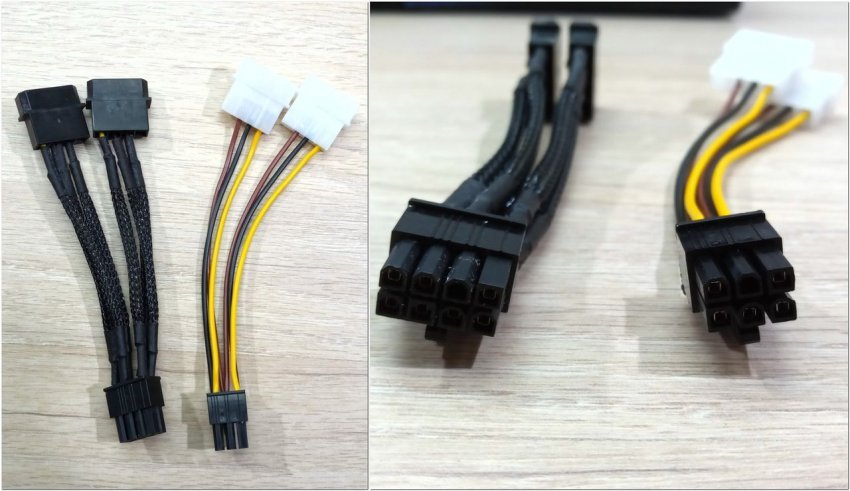 Задняя сторона платы закрыта металлической пластиной с геометрическим рисунком на поверхности. В небольшой нише расположено два разъема питания — на шесть и восемь контактов.