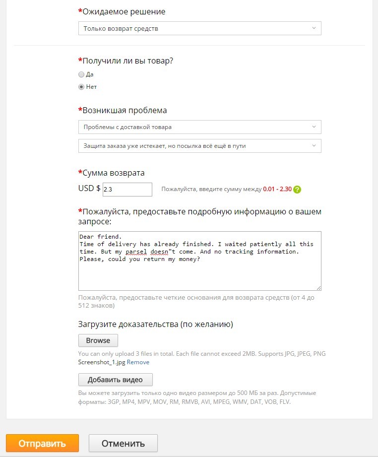 - Прикладываете доказательства (например, принтскрин сервиса отслеживания, который не находит посылку, или переписку с продавцом).