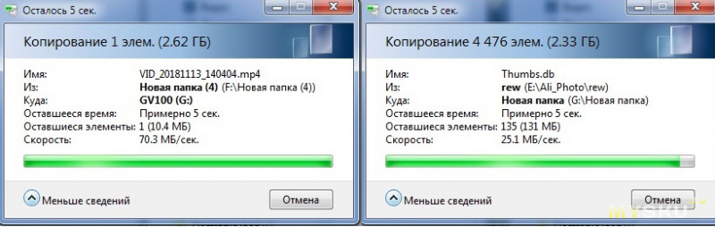 Дальше пробовал писать файлы на уже частично заполненный накопитель, линейная скорость 70 МБ/сек, а при записи большого количества менее объемных файлов (100 папок с фотографиями разного объема) скорость упала до 25 МБ/сек.