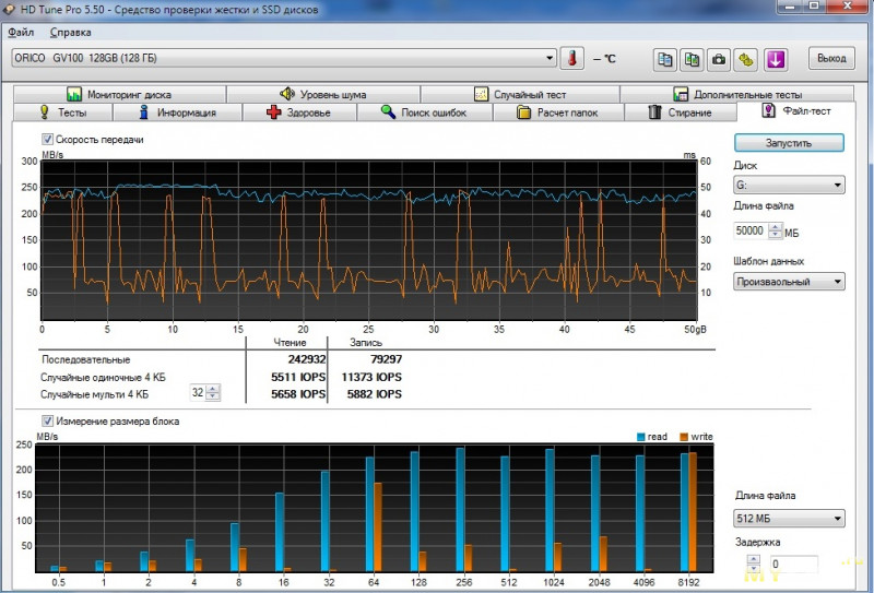 В ходе обзора я использовал эту тестовую программу, но старой версии, здесь провел как в старой, для более корректного сравнения, так и в более новой. Во втором случае тестовый файл имел объем 5ГБ.