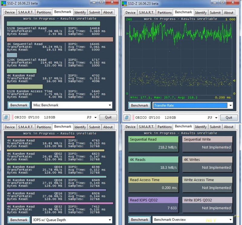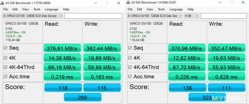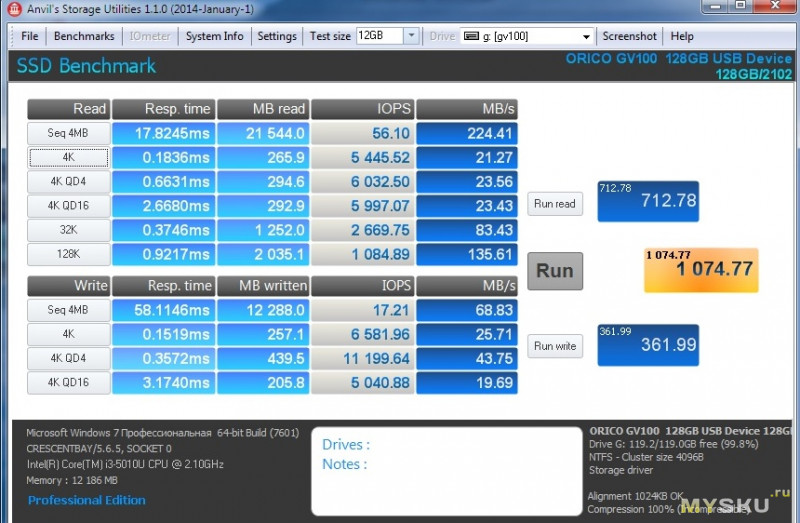 Для этих накопителей немного синтетический тест, хотя он всего лишь повторяет уже показанные выше результаты.