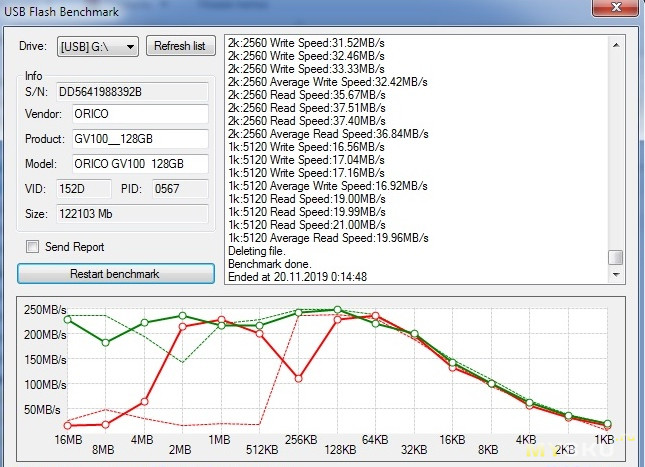 Последний тест при помощи утилит скорее дополнительный, это старенькая программка USB Flash Benchmark. Прогнал пару раз и обратил внимание что если график чтения при двух последовательных прогонах почти не изменился (жирная и пунктирная кривая), то график записи разный первую половину теста (при размере файлов до 128КБ).