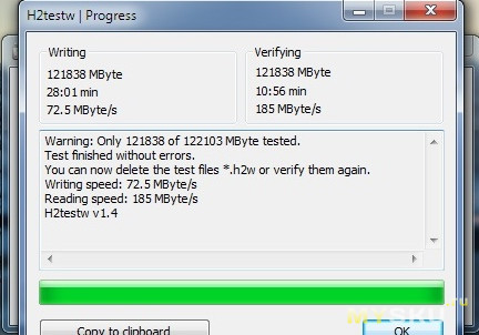 При записи файла относительно большого объема сначала отображалась большая скорость, иногда 250, иногда и более 400 МБ, сек, но на самом деле реальная скорость была куда как ниже.