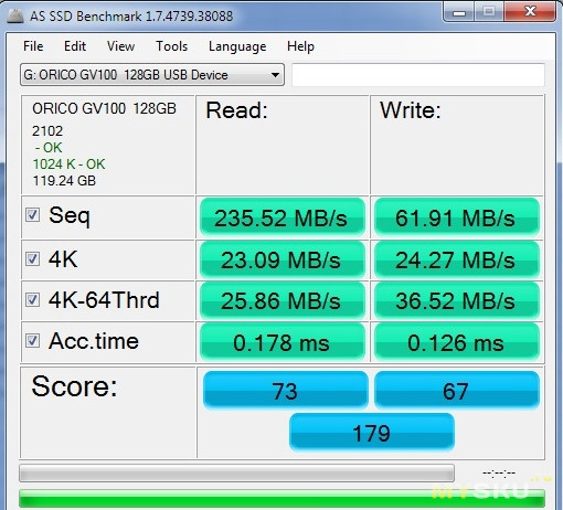AS SSD Benchmark и тоже если к скорости чтения вопросов нет, то скорость записи хромает, около 62МБ/сек в линейном режиме.