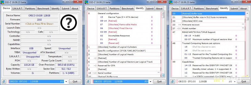 Вторым этапом идет утилита SSD-Z, но много информации она мне не дала, а SMART вообще не захотела показать.