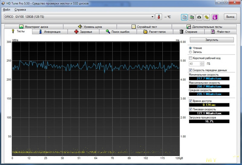 Также провел тест по всему объему при помощи той же программы, график чтения немного кривоват, но держится на уровне 230-240МБ/сек