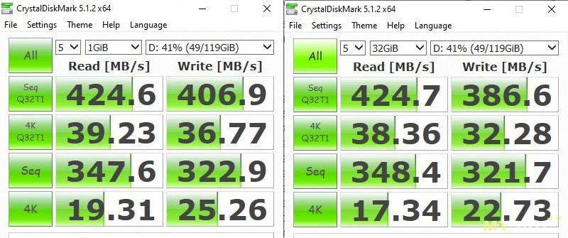 Дальше конечно более привычный большинству пользователей CrystalDiskMark. Я отношусь к его результатам немного скептически, но возможно он подойдет для сравнения с другими устройства, протестированными при помощи этой же программы.