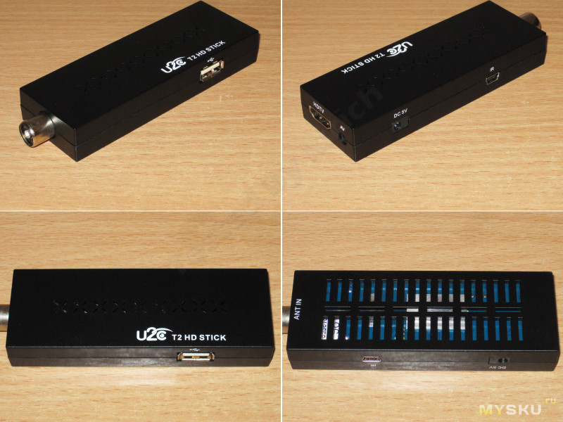 Сам ТВ-тюнер внешне очень напоминает USB TV-бокс, ну или просто большую флешку. Корпус выполнен из пластика, в верхней и нижней части здесь предусмотрены вентиляционные отверстия для отвода тепла, а также объемные прозрачные вставки для приема сигнала пульта Д/У. Спереди располагается разъем USB для подключения к компьютеру или другим устройствам, сзади – стандартный «бытовой» разъем IEC для подключения внешней антенны.