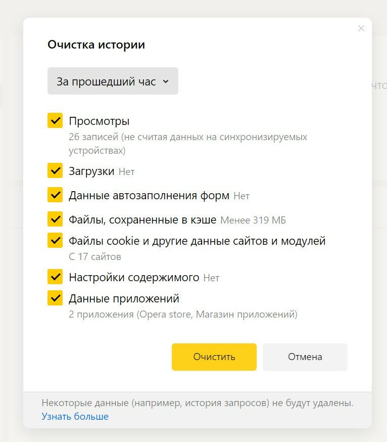 - Также можно выбрать период времени для очистки. В параметрах предлагается удалить данные за последний час, последние 2 часа, последние 4 часа, весь последний день или удалить все данные.