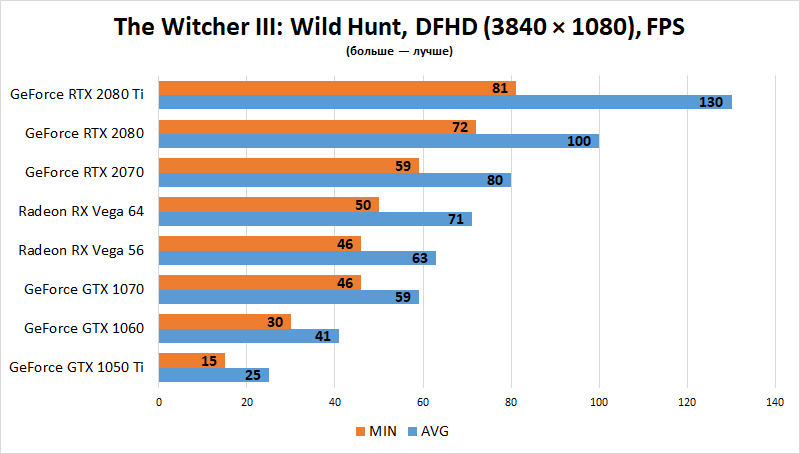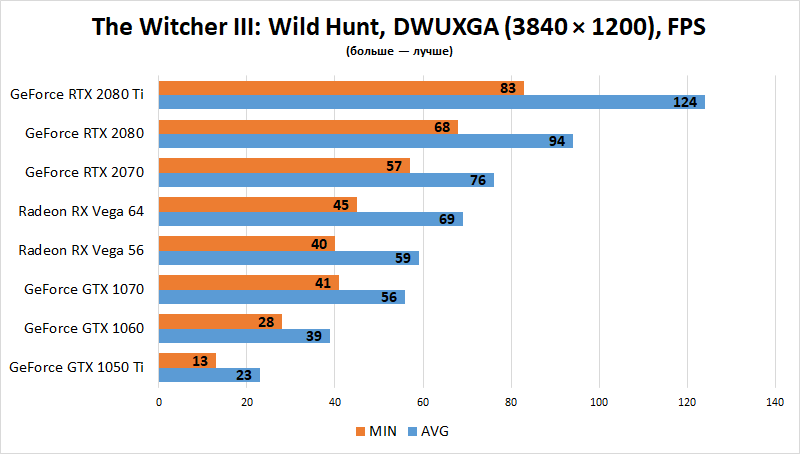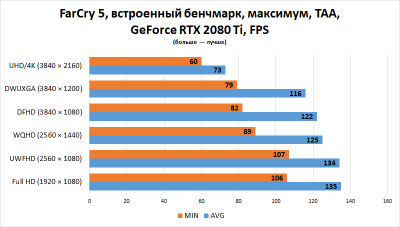 Если мы сравним разрешение Double WUXGA (3840 × 1200) с Ultra HD (3840 × 2160), то увидим, что в последнем случае нагрузка на тестовую систему оказывается значительно выше — в среднем на 32 %. На мой взгляд, разница достаточно ощутима. Получается, при использовании одной и той же видеокарты в стенде вы гарантированно получите на треть FPS больше, используя монитор с разрешением 3840 × 1200, а не дисплей с разрешением 3840 × 2160 пикселей. Следовательно, порог вхождения при использовании сверхширокоформатных устройств вывода изображения оказывается заметно ниже. Естественно, разница в FPS между такими разрешениями, как 2560 × 1080, 3840 × 1080 и 3840 × 2160, оказывается еще больше. Формат UWFHD в плане быстродействия оказывается схож с Full HD и нагружает графический адаптер в среднем на 12 % больше. В случае с GeForce RTX 2080 Ti, конечно же, наблюдается процессорозависимость. В разрешении 2560 × 1080 этот эффект, безусловно, выражен сильнее, чем в 2560 × 1440.