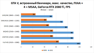 | GTA V, встроенный бенчмарк (последняя сцена) | Макс. качество, дополнительные настройки качества — вкл., масштаб разрешения изображения — выкл., 16 × AF | Без сглаживания | |