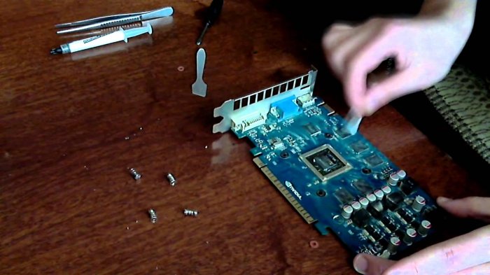 Начинаем наносить термопасту на видеокарту. Термопасту выбираем в зависимости от мощности видеокарты. На простой подойдет и КПТ-8, а вот в более игровых я посоветовал бы заморочиться. Ведь чем ниже будет температура, тем больше будет её ресурс и в требовательных играх она не будет перегреваться.