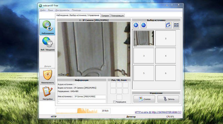 Имеет богатые возможности по настройке реакции на событие – запись видео, сохранение снимка, загрузка видеофайла на FTP-сервер, отправка СМС, запуск внешнего приложения с заданными параметрами и т.д. Программа имеет встроенный веб-сервер, и вы сможете наблюдать картинку с камеры вживую в окне любого браузера на любом устройстве, подключенном к сети. Правда, для этого надо иметь некоторое представление об устройстве сети Ethernet и, возможно, придется пробросить порты через файрволл или роутер.