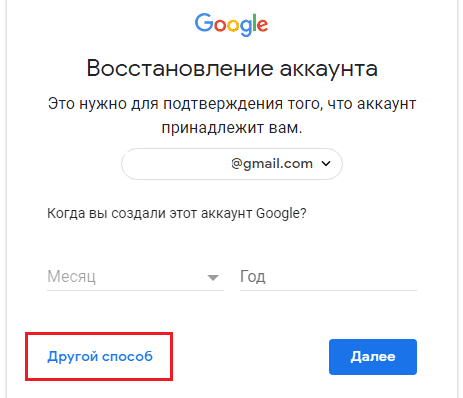 - Кликните по ссылке «Другой способ». Сначала Гугл предложит вам восстановление при помощи дополнительной почты.