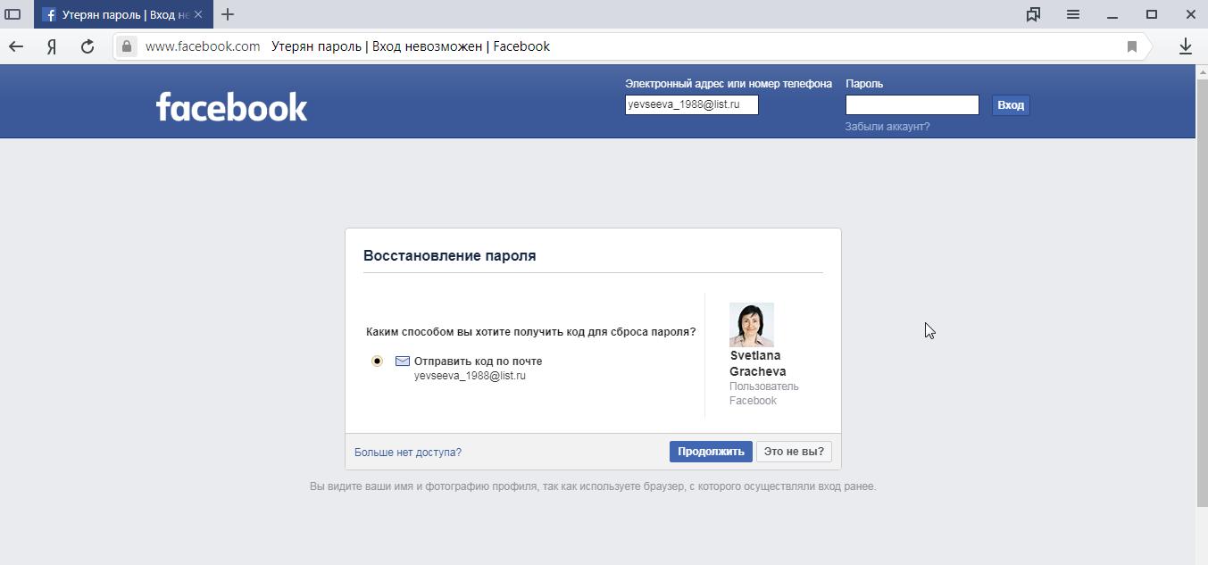 Не помните емайл, номер, к которому привязали аккаунт? Введите свое имя в ресурсе. Далее, коснитесь поиска. Фейсбук покажет все аккаунты, которые совпадают по имени с вашим. По вы можете найти свою страничку. После, коснитесь формы «это мой аккаунт». Выберите способ, с помощью которого сервис вышлет вам другие данные для восстановления.