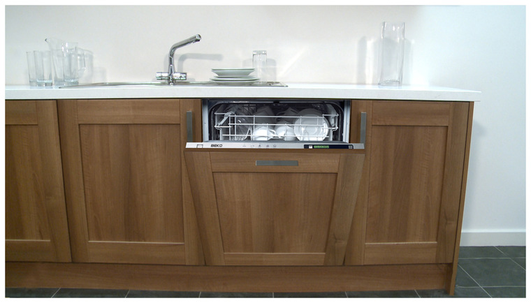 Полностью встроенная техника в дальнейшем прикрывается красивым кухонным фасадом и имеет совсем непрезентабельный внешний вид в магазине. В связи с отсутствием красивого декора стоимость сравнительно невелика. Зато есть одно большое неудобство: все управление запрятано вовнутрь, и вмешаться в процесс мытья посуды практически невозможно.