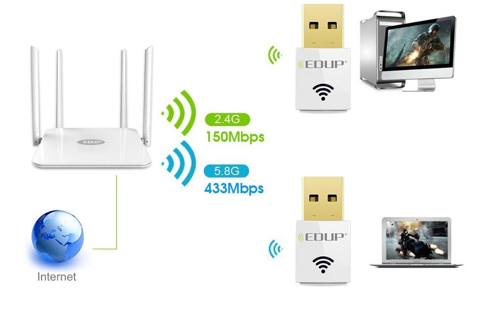 В 2009 году появился 802.11n и поддерживающие этот стандарт устройства научились транслировать трафик в двух полосах пропускания: 2,4 ГГц и 5 ГГц. Максимальная скорость передачи с помощью Wi-Fi адаптер USB 5 ГГц поднялась до 600 Мбит/с, если использовать только полосу шириной в 5 гигагерц.