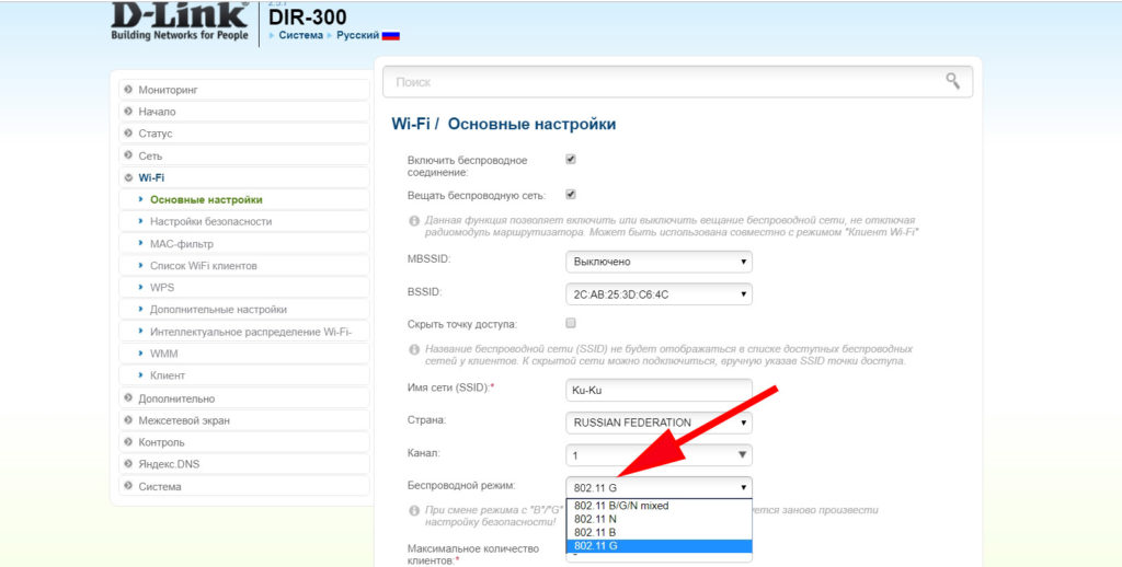 Настройка режима Wi-Fi и ширины канала на роутере D-Link