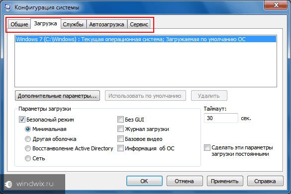Во вкладке «Загрузка» настраиваются детальные настройки запуска. В области (1) выбирается система, которая будет загружаться по умолчанию. Актуально, если у вас несколько систем на одном компьютере. В этом окне можно как задать загрузку системы по умолчанию, так и убрать из загрузчика одну из установленных (система не удаляется, а удаляется только возможность загрузки).