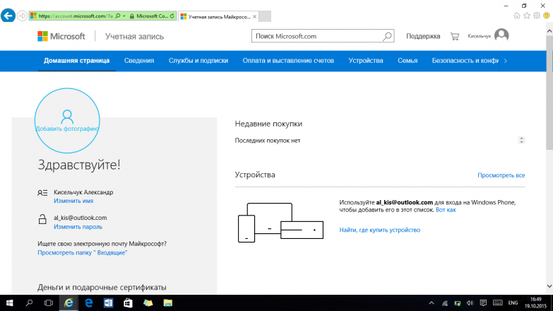 Мой профайл в личном кабинете Microsoft Personal Data, перечисляет личную информацию о себе, которую вы, возможно, заполнили при создании Live-учетной записи.