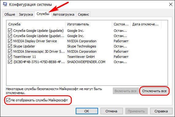 Затем откройте закладку Службы. Здесь отметьте пункт «Не отображать службы Майкрософта», а после нажмите на кнопку «Отключить все». Таким образом, вы отключите те, которые не являются неотъемлемой частью Виндовс и могут вызывать ошибки.