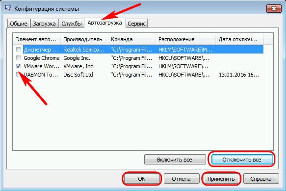 Затем переключаемся на вкладку «Автозагрузка» кнопкой «Отключить все» убираем все объекты из автозагрузки, а потом поочерёдно включаем лишь отдельные. Далее следует стандартный набор – кнопки «Применить», «Ок» и перезагрузка.