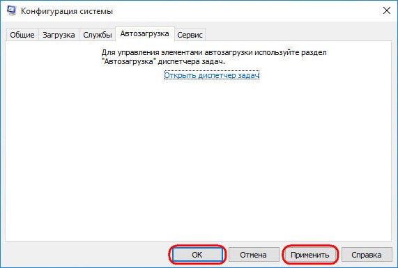 После чего можно закрыть диспетчер задач. Вернувшись в окно конфигурации системы, жмём кнопку «Применить», затем «Ок».